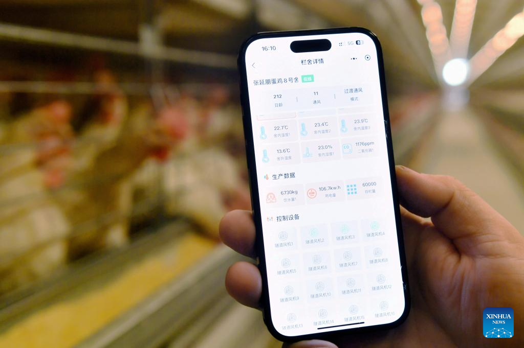 A worker checks the breeding conditions of a chicken farm via a cell phone in Guantao County, north China's Hebei Province, March 8, 2024. In recent years, Guantao County has applied smart technologies to agricultural production, giving impetus to the modernization of agriculture. (Xinhua/Wang Xiao)