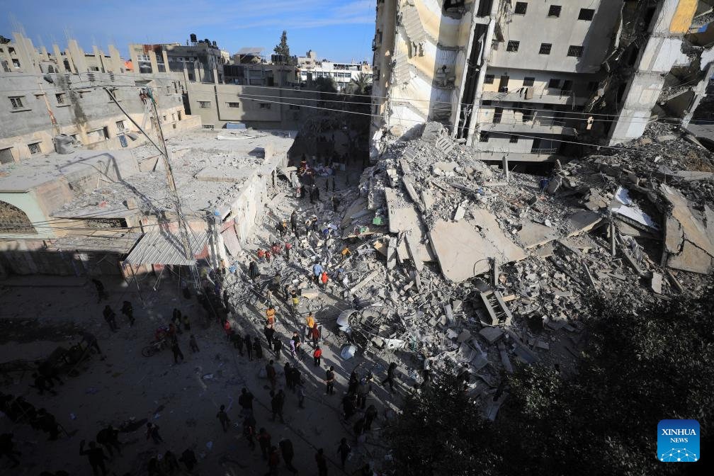 People inspect destroyed buildings after intense airstrikes in the southern Gaza Strip city of Rafah, on March 9, 2024. The Palestinian death toll from ongoing Israeli attacks on the Gaza Strip has risen to 30,960 with 72,524 others wounded, the Hamas-run Health Ministry said in a press statement on Saturday. (Photo by Yasser Qudih/Xinhua)