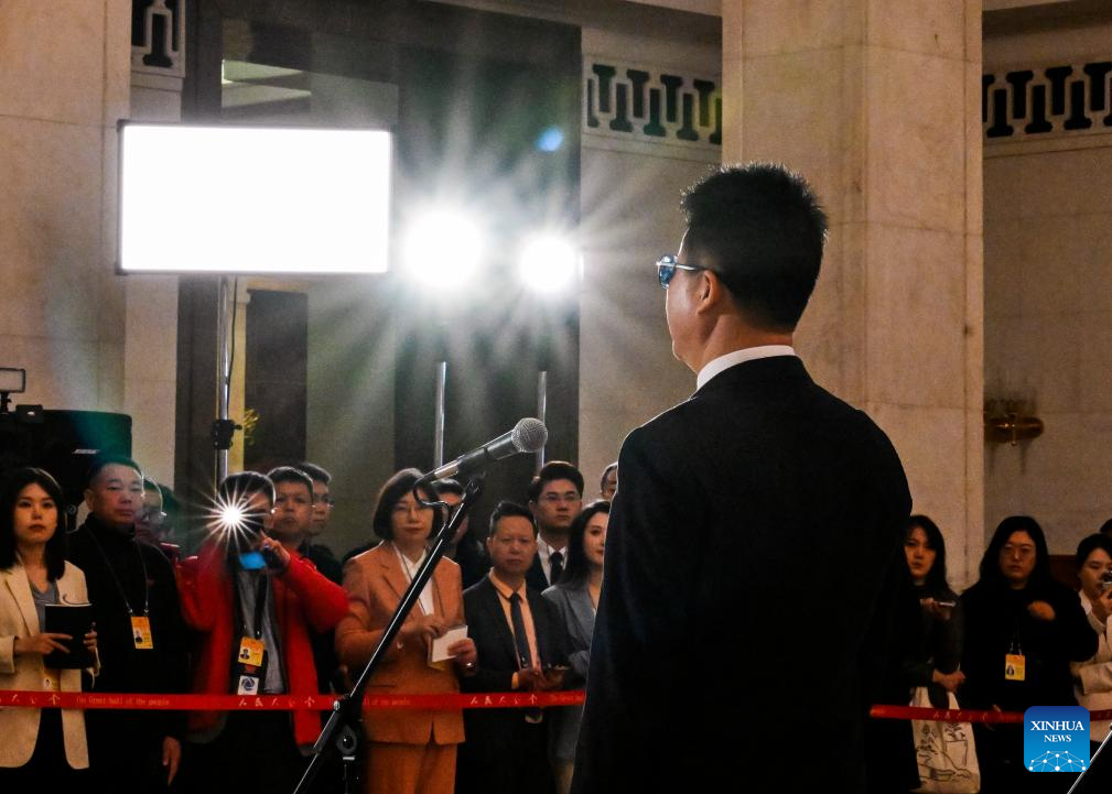 Wang Yongcheng, a deputy to the 14th National People's Congress (NPC), is interviewed ahead of the second plenary meeting of the second session of the 14th NPC at the Great Hall of the People in Beijing, capital of China, March 8, 2024. (Xinhua/Cai Yang)