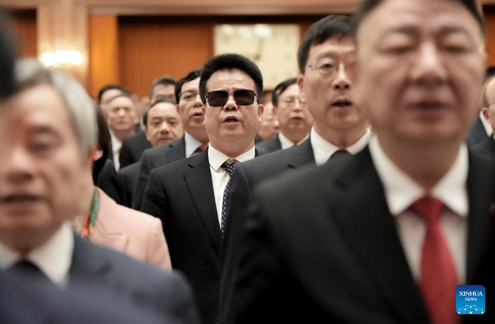 Wang Yongcheng (C), a deputy to the 14th National People's Congress (NPC), sings the national anthem while attending the opening meeting of the second session of the 14th NPC at the Great Hall of the People in Beijing, capital of China, March 5, 2024. (Xinhua/Wang Yuguo)