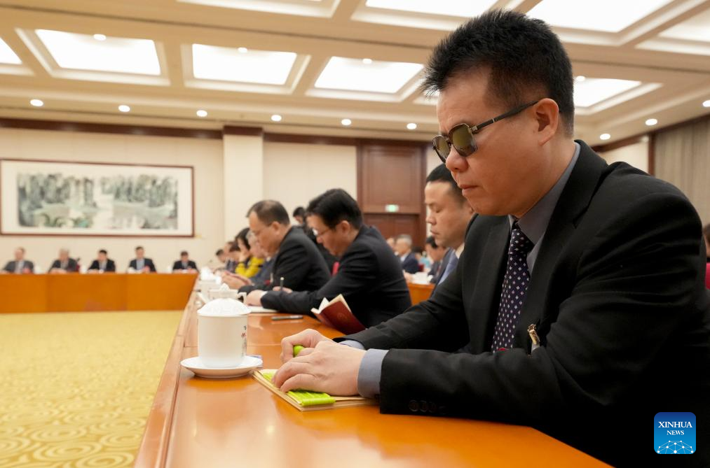 Wang Yongcheng (1st R), a deputy to the 14th National People's Congress (NPC), takes notes in Braille during a group deliberation at the second session of the 14th NPC at the Great Hall of the People in Beijing, capital of China, March 6, 2024. (Xinhua/Wang Yuguo)