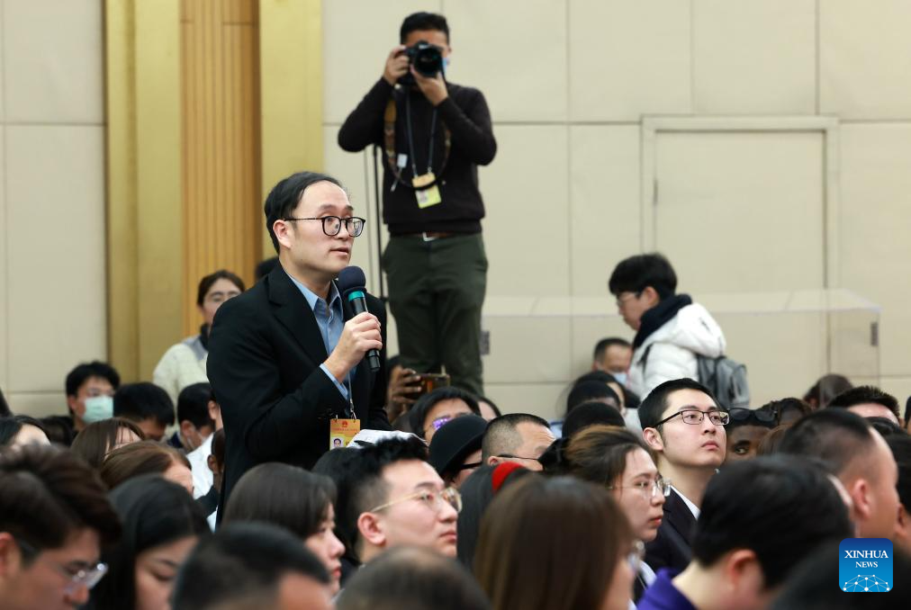 A journalist asks questions at a press conference on people's livelihood for the second session of the 14th National People's Congress (NPC) in Beijing, capital of China, March 9, 2024. China's Minister of Education Huai Jinpeng, Minister of Human Resources and Social Security Wang Xiaoping, Minister of Housing and Urban-Rural Development Ni Hong, and Chief of the National Disease Control and Prevention Administration Wang Hesheng attended the press conference on Saturday. (Xinhua/Wang Jingqiang)