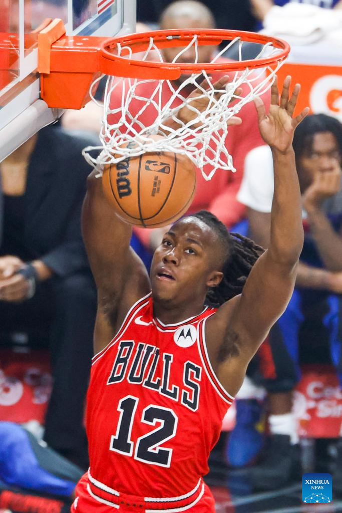 Chicago Bulls' Ayo Dosunmu dunks during the 2023-2024 NBA regular season match between Los Angeles Clippers and Chicago Bulls in Los Angeles, the United States, March 9, 2024. (Photo by Ringo Chiu/Xinhua)
