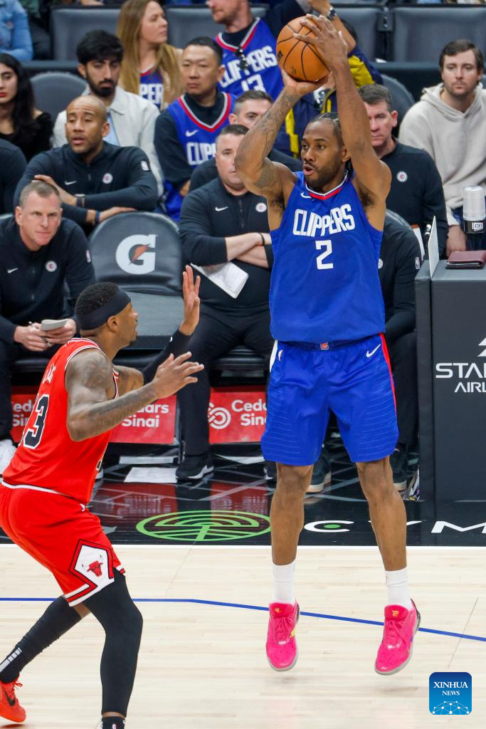 Los Angeles Clippers' Kawhi Leonard (R) shoots during the 2023-2024 NBA regular season match between Los Angeles Clippers and Chicago Bulls in Los Angeles, the United States, March 9, 2024. (Photo by Ringo Chiu/Xinhua)