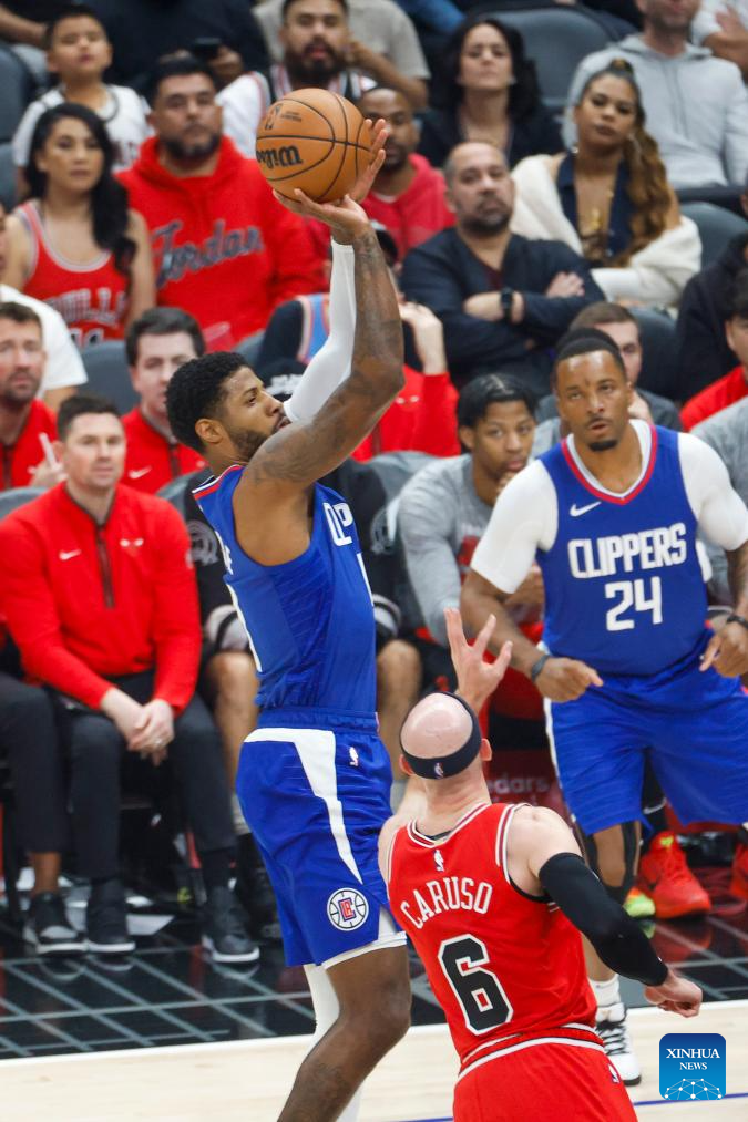 Los Angeles Clippers' Paul George (top) shoots during the 2023-2024 NBA regular season match between Los Angeles Clippers and Chicago Bulls in Los Angeles, the United States, March 9, 2024. (Photo by Ringo Chiu/Xinhua)