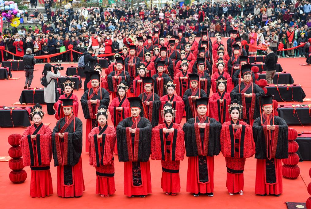 This photo taken on March 9, 2024 shows couples dressed in traditional costumes taking part in a group wedding in Tongnan District of Chongqing, southwest China. (Xinhua/Wang Quanchao)