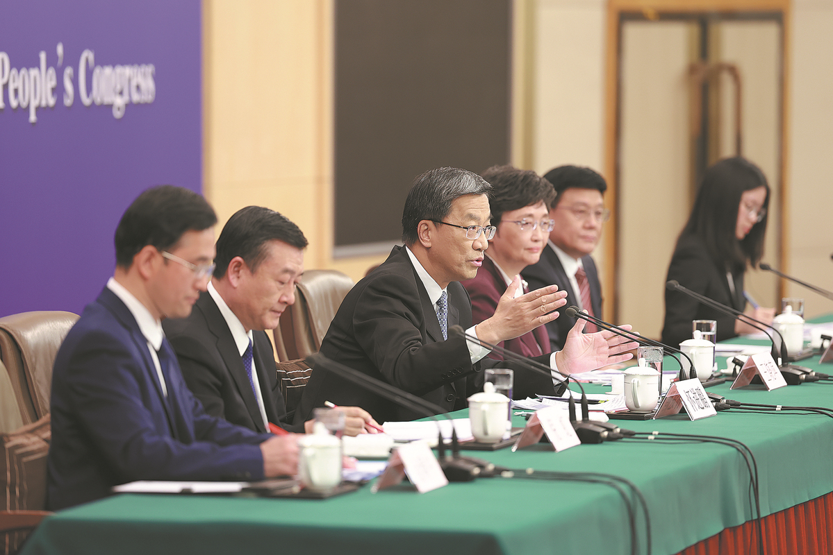 Huai Jinpeng (third from left), minister of education, speaks during a news conference on Saturday on the sidelines of the two sessions, the annual gatherings of China's top legislative and political advisory bodies, in Beijing. [PHOTO by FENG YONGBIN/CHINA DAILY]