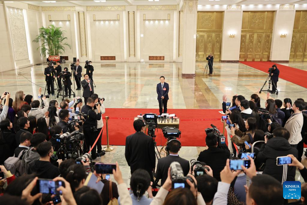 Yu Jianhua, head of the General Administration of Customs (GAC) of China, gives an interview after the closing meeting of the second session of the 14th National People's Congress (NPC) at the Great Hall of the People in Beijing, capital of China, March 11, 2024. (Xinhua/Liu Xu)