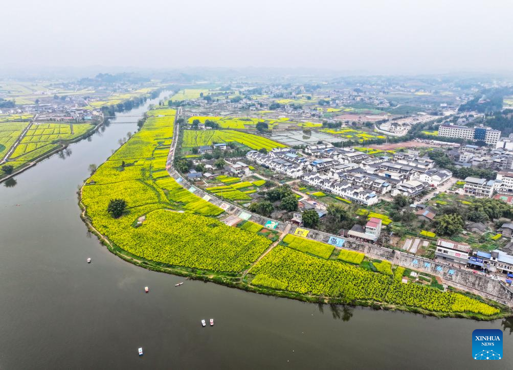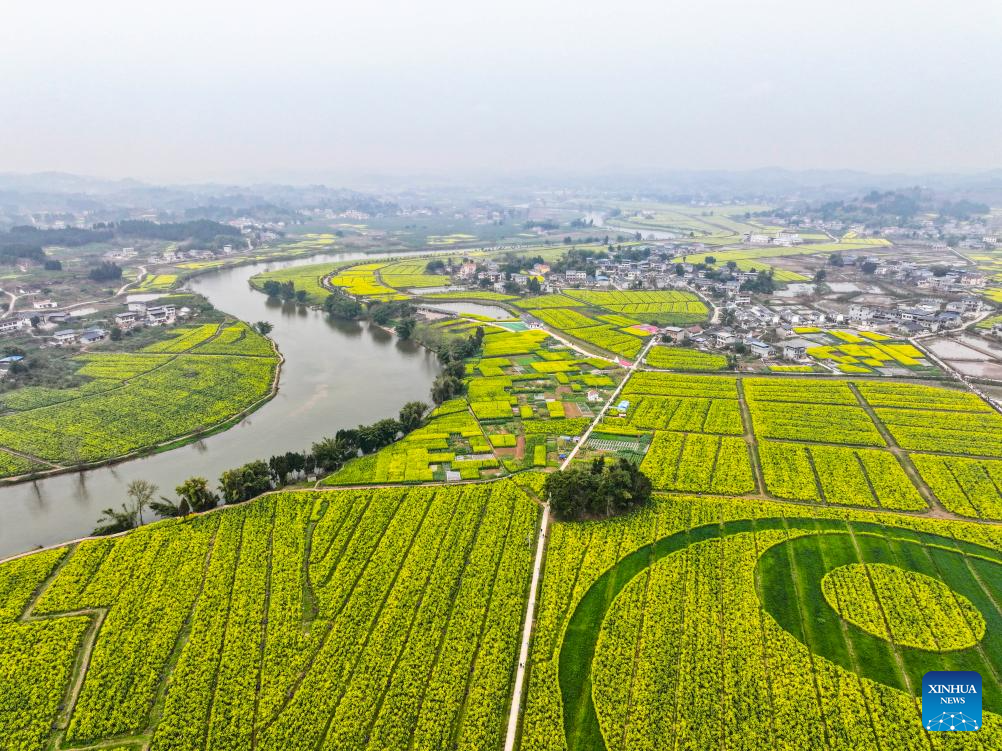 An aerial drone photo taken on March 9, 2024 shows a view of oilseed rape fields at Chongkan scenic spot in Tongnan District, southwest China's Chongqing Municipality. (Xinhua/Wang Quanchao)