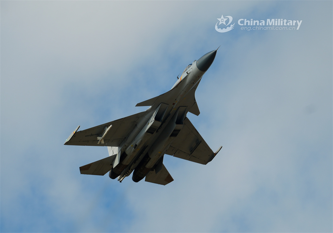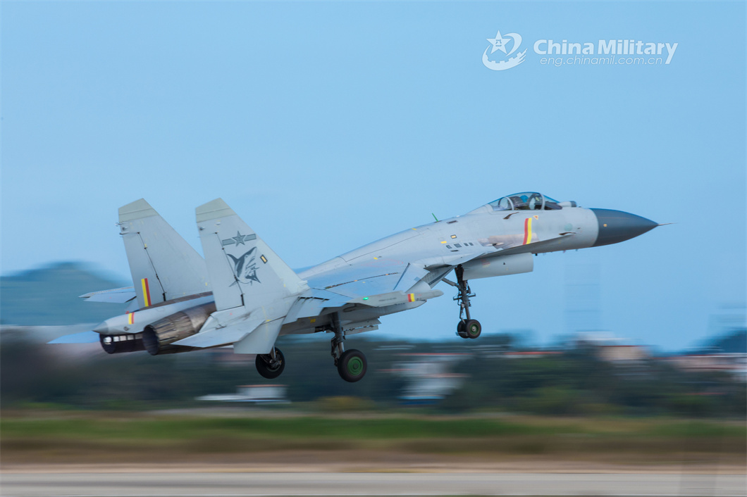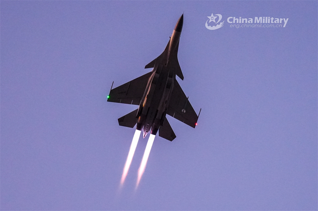 Fighter jet attached to a naval aviation unit soars into the sky during a round-the-clock flight training exercise recently. (eng.chinamil.com.cn/Photo by Li Yufei)