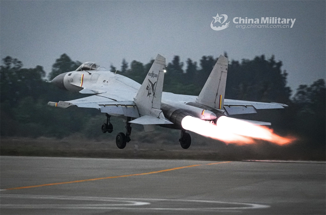 Fighter jet attached to a naval aviation unit takes off for a round-the-clock flight training exercise recently. (eng.chinamil.com.cn/Photo by Li Yufei)