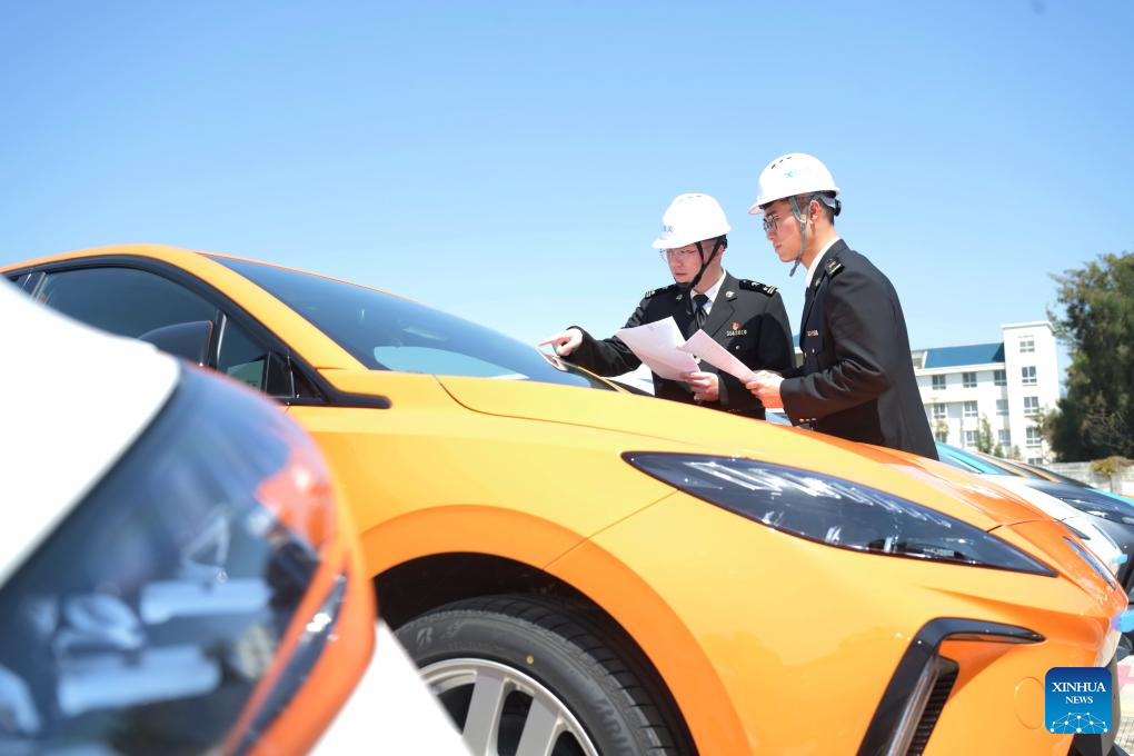 Customs officer Lin Zheng checks a vehicle for export at Jiangyin terminal of Fuzhou Port in Fuzhou, southeast China's Fujian Province, March 12, 2024. (Xinhua/Lin Shanchuan)