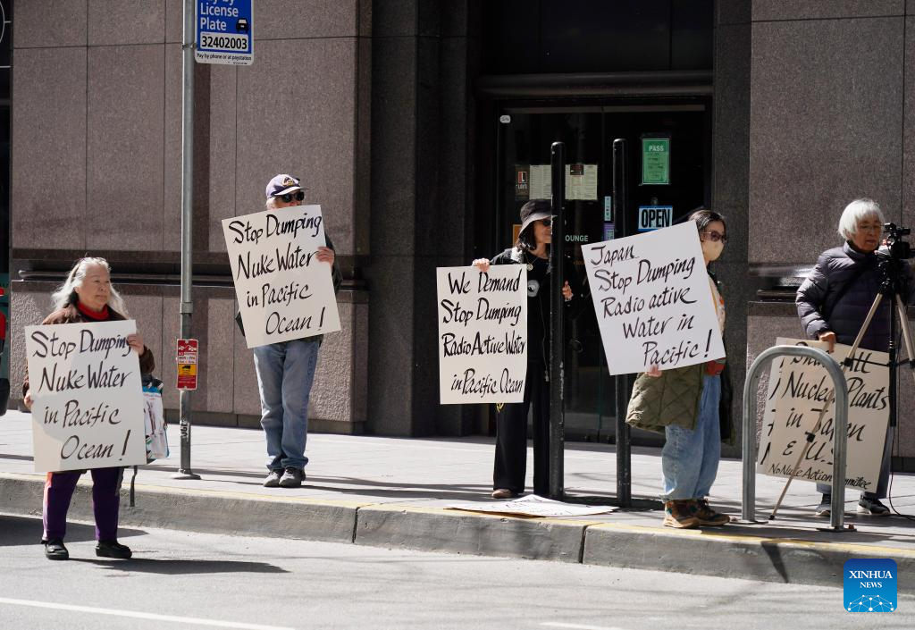 People take part in a rally against Japan's ocean discharge of Fukushima nuclear-contaminated wastewater in front of the Consulate General of Japan in San Francisco, California, the United States, March 11, 2024. (Photo by Li Jianguo/Xinhua)