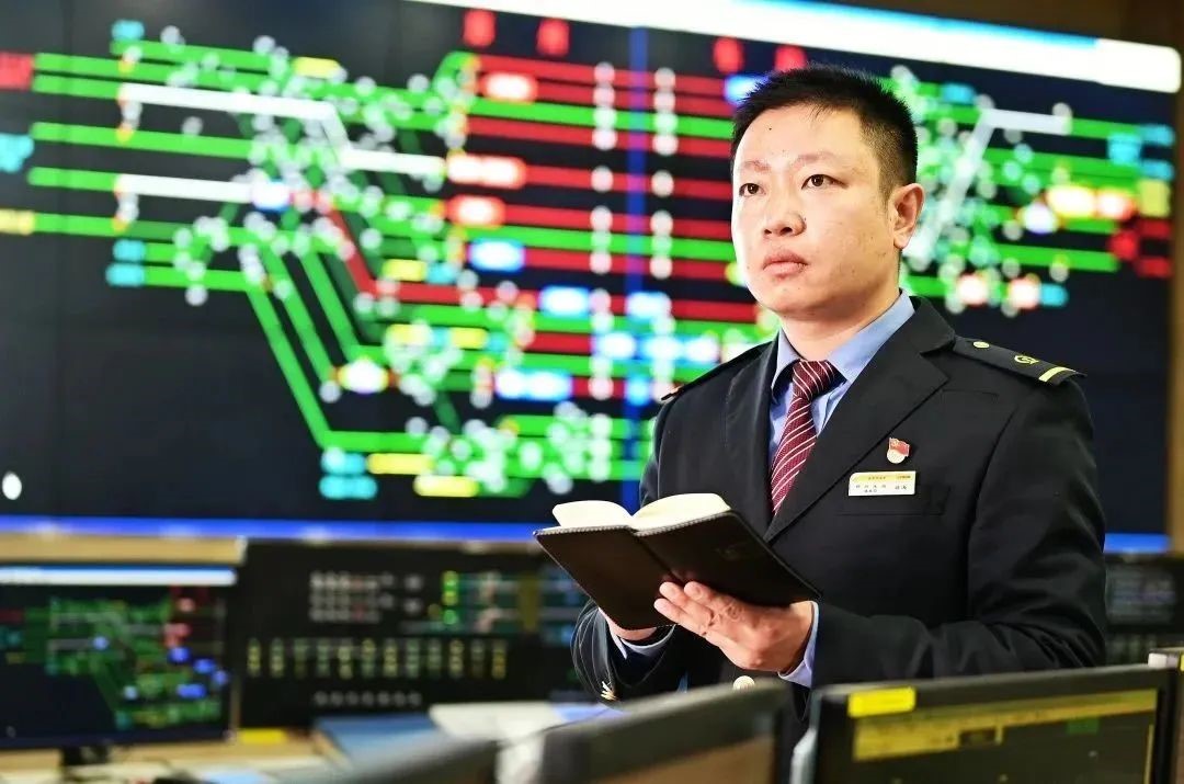 Jiang Tao checks the information of trains. (Photo from the official public account of Renmin Tiedao on WeChat)
