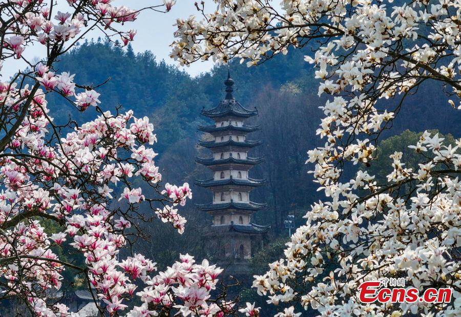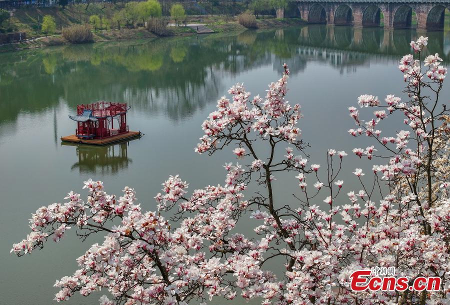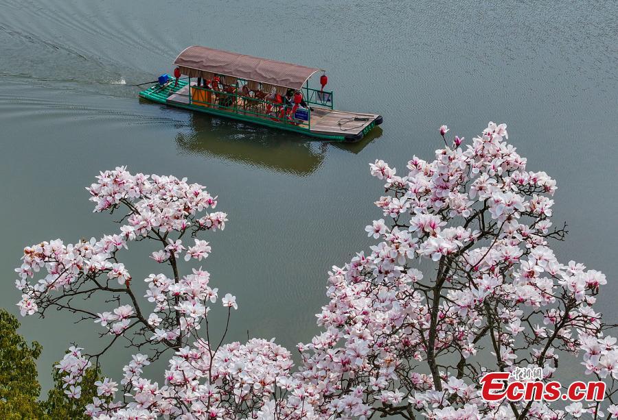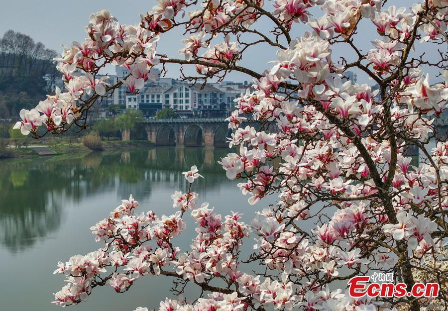 Magnolia flowers blossom along the Xin'an River, adding beauty in the spring season to Huangshan, east China's Anhui Province, March 12, 2024. (Photo: China News Service/Shi Yalei)