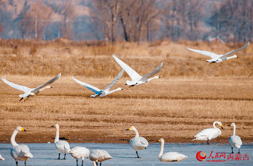 White swans fly at a wetland in Togtoh county, north China's Inner Mongolia Autonomous Region. (Photo/Wuligeng)