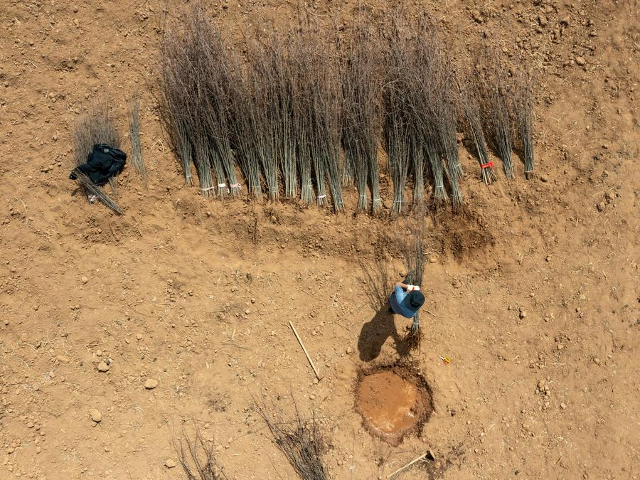 An aerial drone photo taken on March 10, 2024 shows a villager bundling up Cut-leaf Crabapple saplings in Daofu County, southwest China's Sichuan Province. (Xinhua/Shen Bohan)