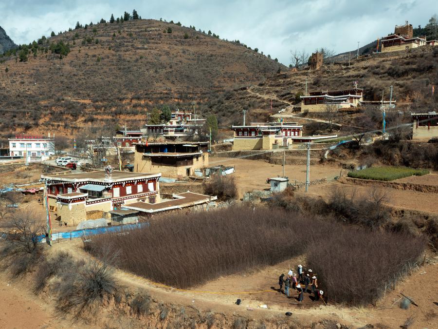 A drone photo taken on March 10, 2024 shows villagers selecting Cut-leaf Crabapple saplings in Daofu County, southwest China's Sichuan Province. (Xinhua/Shen Bohan)