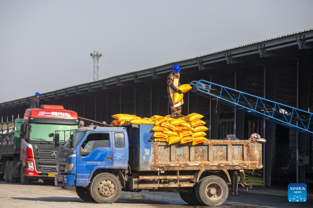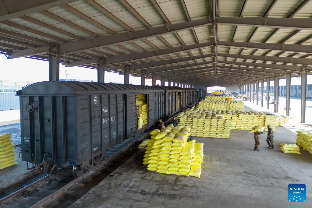 A drone photo shows workers transporting chemical fertilizer at the freight yard of Zhaodong Station, Daqing depot of China Railway Harbin Bureau Group Co., Ltd., northeast China's Heilongjiang Province, March 13, 2024. As spring farming activities is about to start in Heilongjiang, a major grain producing province, China Railway Harbin Bureau Group Co., Ltd. has established a regular contact mechanism involving local fertilizer dealers, with more than 500,000 tonnes of fertilizer transported since the beginning of 2024. (Xinhua/Zhang Tao)