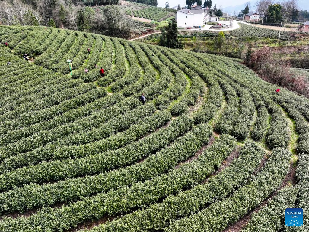 An aerial drone photo taken on March 12, 2024 shows farmers picking tea leaves in Zhangmu Village of Wuma Town, Fengjie County, southwest China's Chongqing Municipality.?(Xinhua/Wang Quanchao)