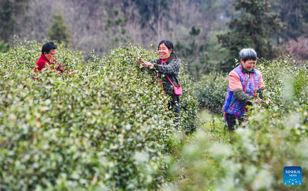 Farmers pick tea leaves in Zhangmu Village of Wuma Town, Fengjie County, southwest China's Chongqing Municipality, March 12, 2024.?(Xinhua/Wang Quanchao)
