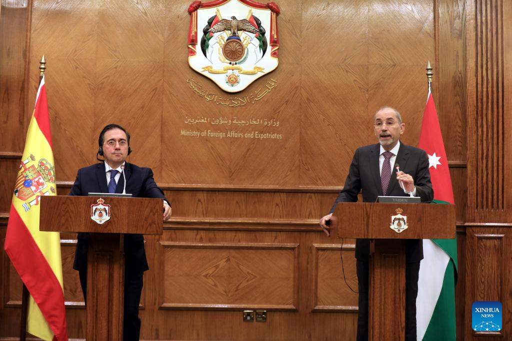 Spanish Foreign Minister Jose Manuel Albares addresses a press conference with Jordanian Foreign Minister Ayman Safadi (not in the picture) in Amman, Jordan, on March 13, 2024. Jordanian and Spanish foreign ministers on Wednesday agreed that there is no alternative to the UNRWA, the UN agency for Palestinian refugees, especially in light of the humanitarian catastrophe in Gaza. (Photo by Mohammad Abu Ghosh/Xinhua)