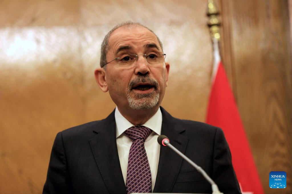 Jordanian Foreign Minister Ayman Safadi addresses a press conference with Spanish Foreign Minister Jose Manuel Albares (not in the picture) in Amman, Jordan, on March 13, 2024. Jordanian and Spanish foreign ministers on Wednesday agreed that there is no alternative to the UNRWA, the UN agency for Palestinian refugees, especially in light of the humanitarian catastrophe in Gaza. (Photo by Mohammad Abu Ghosh/Xinhua)
