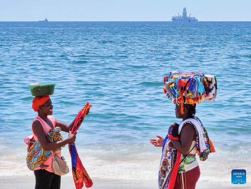 Vendors talk on the beach in Luanda, capital of Angola, March 9, 2024. (Xinhua/Li Yahui)