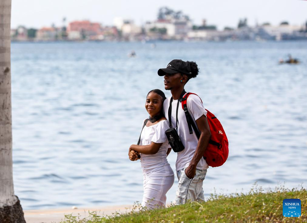 People take a walk along the coast in Luanda, capital of Angola, March 9, 2024. (Xinhua/Li Yahui)