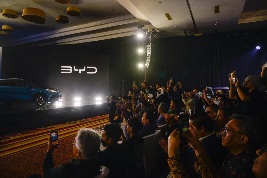 Journalists take photos and videos during BYD grand launch in Jakarta, Indonesia, Jan. 18, 2024. China's BYD, a global leader in the sale of pure electric vehicles (EV), launched three new electric passenger cars, SEAL, Atto 3, and Dolphin, in Jakarta, Indonesia to further expand in the Southeast Asia region. (Xinhua/Xu Qin)