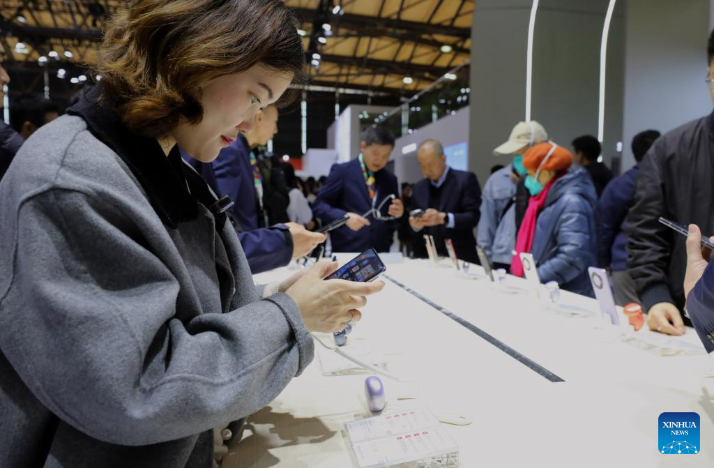 Visitors try smartphones at Huawei's booth during the 2024 Appliance & Electronics World Expo (AWE2024) in east China's Shanghai, March 14, 2024. With the theme of "Smartize the Future", the AWE2024 kicked off here on Thursday. The world's leading brands in the field of home appliances and consumer electronics gathered at the expo to showcase their latest innovations. (Xinhua/Fang Zhe)