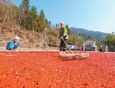 Photo shows farmers air-drying seeds of Sarcandra glabra, a medicinal plant, in a Sarcandra glabra production base in Xingyue village, Rongjiang county, southwest China's Guizhou Province. Leveraging its rich forest resources, Rongjiang county has vigorously developed the understory economy by promoting the cultivation of medicinal herbs of traditional Chinese medicine, including Sarcandra glabra, in forests, thus boosting the incomes of farmers. (Photo/Zhou Guangsheng)