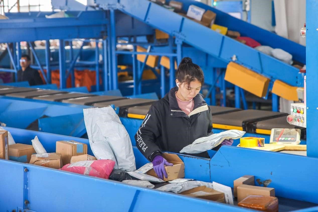 A woman works on an intelligent sorting line in a logistics park in Lanshan county, Yongzhou, central China's Hunan province. (People's Daily Online/Peng Hua)