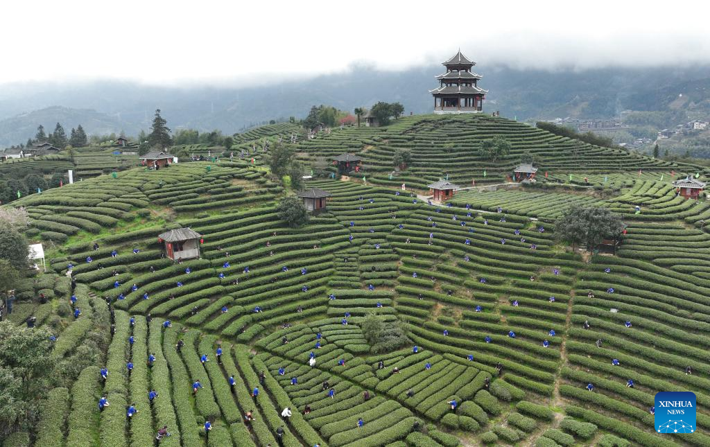 An aerial drone photo taken on March 14, 2024 shows villagers picking tea leaves in Buyang Village of Bajiang Township in Sanjiang Dong Autonomous County, south China's Guangxi Zhuang Autonomous Region. A two-day event promoting the tea culture kicked off in Sanjiang on Thursday. A series of activities, such as a ceremony marking the start of spring tea picking, tea art display, contracts signing, and technical exchange, are held to promote the high-quality development of local tea industry. (Xinhua/Huang Xiaobang)