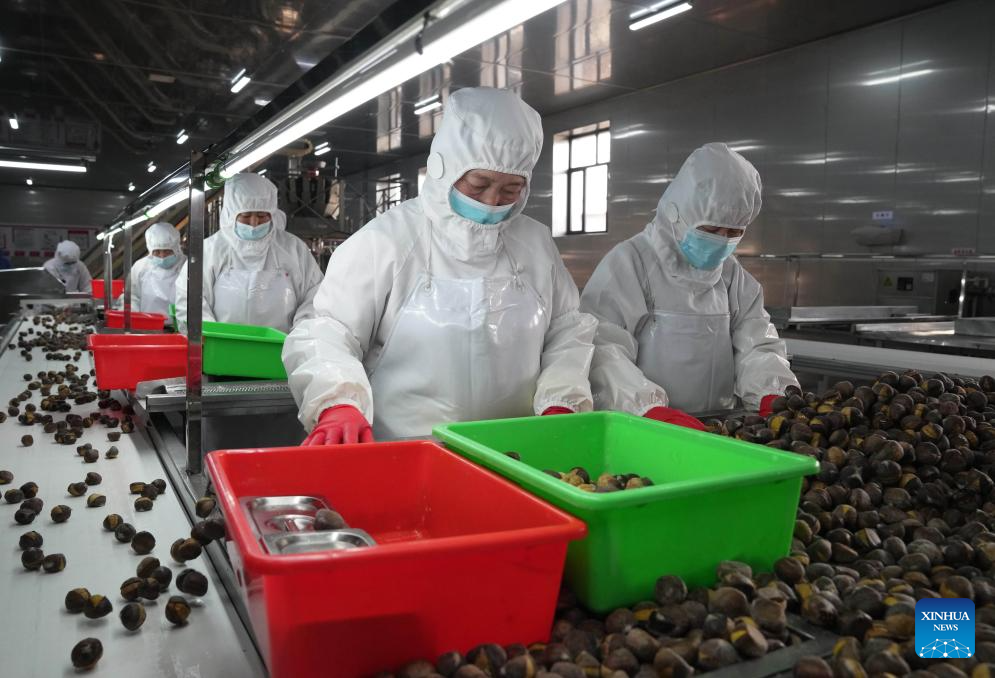 Staff members work at a chestnut processing workshop in Zunhua, north China's Hebei Province, March 14, 2024. Zunhua City has leveraged its abundant resources of chestnuts, peaches, walnuts and hawthorns to develop the agricultural products processing industry. (Xinhua/Yang Shiyao)