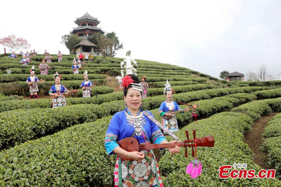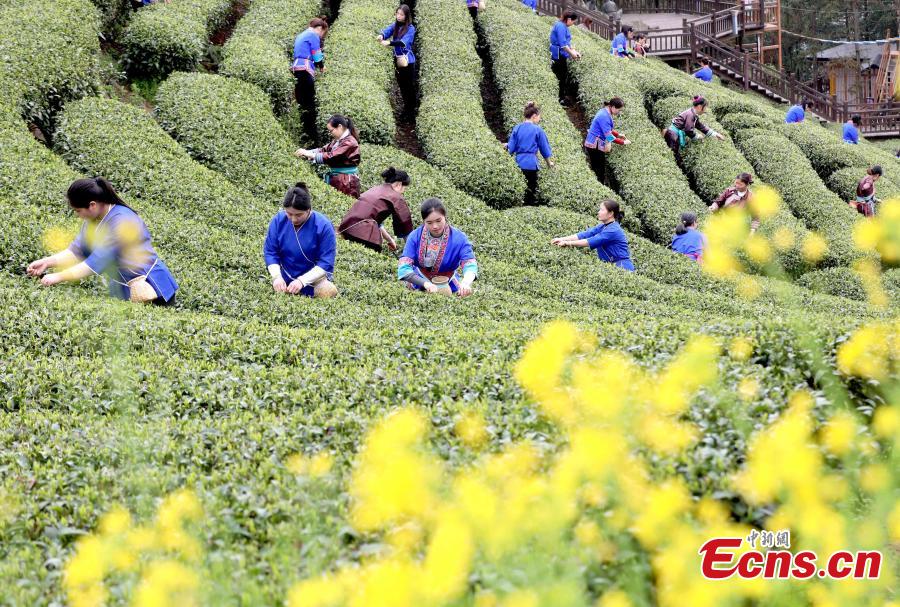 Villagers harvest tea leaves in a tea garden in Sanjiang Dong Autonomous County, South China's Guangxi Zhuang Autonomous Region, March 14, 2024. (Photo: China News Service/Wu Lianxun)