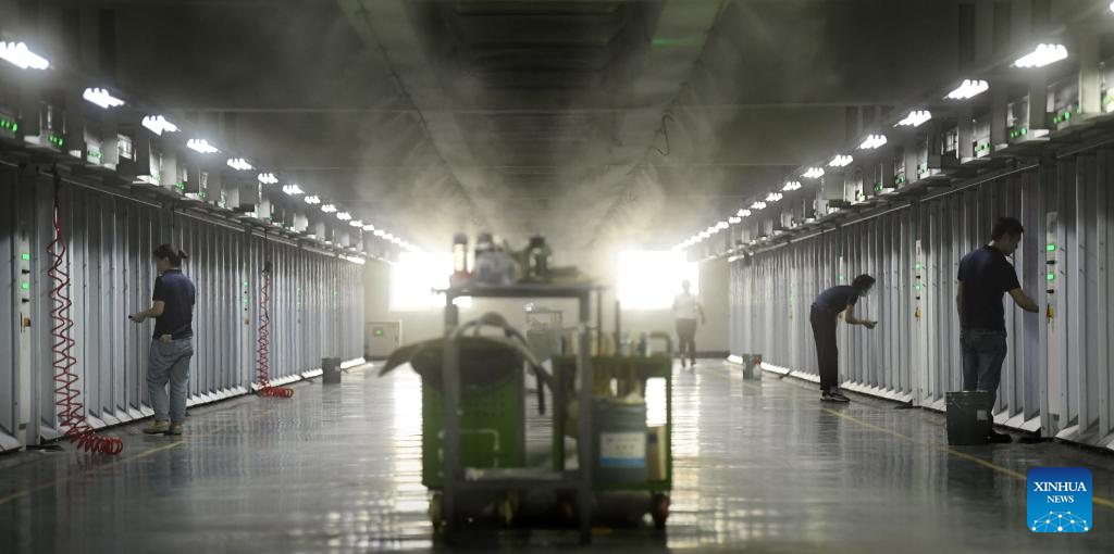 Robots deposit fiber products into a three-dimensional warehouse at a company in Keqiao District of Shaoxing, east China's Zhejiang Province, March 14, 2024. Keqiao District of Shaoxing is a cluster base for the textile industry, housing more than 8,000 textile businesses with an output value of over 100 billion yuan(about 13.9 billion U.S. dollars). In recent years, the district has promoted transformation and upgrading, introducing environmentally friendly machinery and innovative technologies. The local traditional industry, initially labor-intensive, is making a switch to a low-pollution, high-tech, and high-value advanced manufacturing segment. (Xinhua/Weng Xinyang)