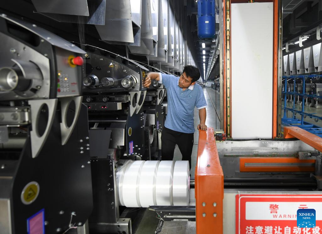 A worker operates an automated winder at a company in Keqiao District of Shaoxing, east China's Zhejiang Province, March 14, 2024. Keqiao District of Shaoxing is a cluster base for the textile industry, housing more than 8,000 textile businesses with an output value of over 100 billion yuan(about 13.9 billion U.S. dollars). In recent years, the district has promoted transformation and upgrading, introducing environmentally friendly machinery and innovative technologies. The local traditional industry, initially labor-intensive, is making a switch to a low-pollution, high-tech, and high-value advanced manufacturing segment. (Xinhua/Weng Xinyang)