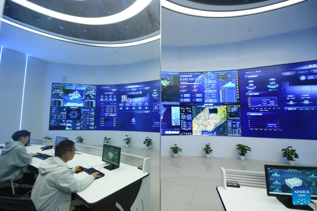 Workers work at a control center of intelligent production at a company in Keqiao District of Shaoxing, east China's Zhejiang Province, March 14, 2024. Keqiao District of Shaoxing is a cluster base for the textile industry, housing more than 8,000 textile businesses with an output value of over 100 billion yuan(about 13.9 billion U.S. dollars). In recent years, the district has promoted transformation and upgrading, introducing environmentally friendly machinery and innovative technologies. The local traditional industry, initially labor-intensive, is making a switch to a low-pollution, high-tech, and high-value advanced manufacturing segment. (Xinhua/Weng Xinyang)