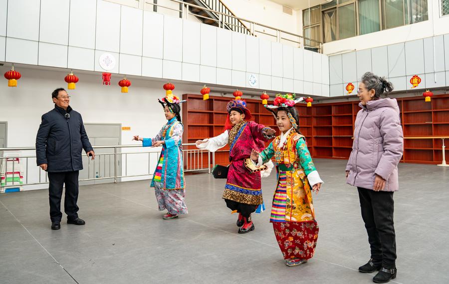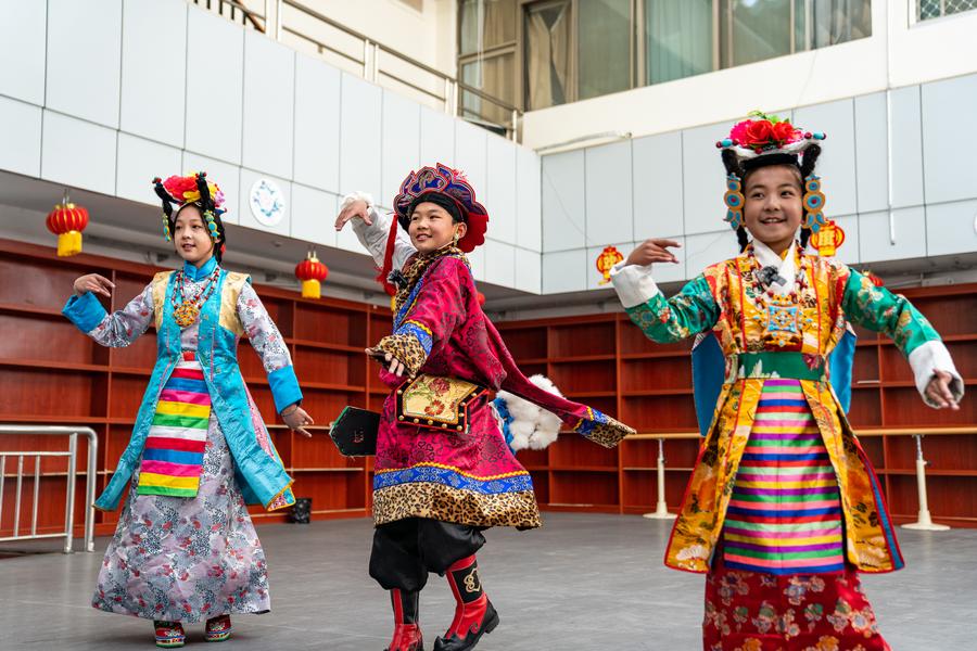 Tenzin Donden (C) and other students perform Tibetan opera in Lhasa, southwest China's Xizang Autonomous Region, Feb. 26, 2024. (Xinhua/Tenzin Nyida)