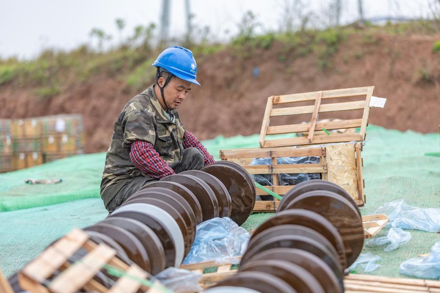 A worker installs insulators at the construction site of the Sichuan-Chongqing 1,000kV UHV AC project in Shaoyun Town of Tongliang District, southwest China's Chongqing, March 17, 2024. (Xinhua/Huang Wei)