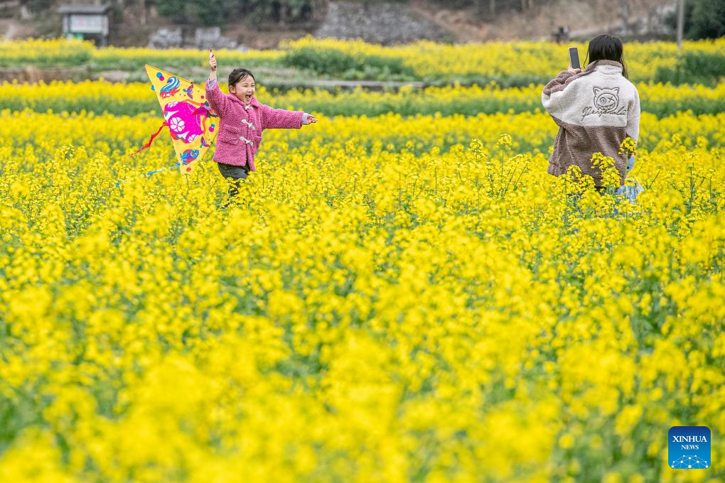 A girl flies a kite amid blooming yellow canola flowers in Changsheng Town of Pengshui Miao and Tujia Autonomous County, southwest China's Chongqing, March 16, 2024. Changsheng Town has made efforts to inject new vitality into rural revitalization in recent years. The town has built a demonstration base where farmers cultivate paddy rice and cole in rotation, and held a variety of agritourism activities to improve farmers' incomes. (Xinhua/Tang Yi)