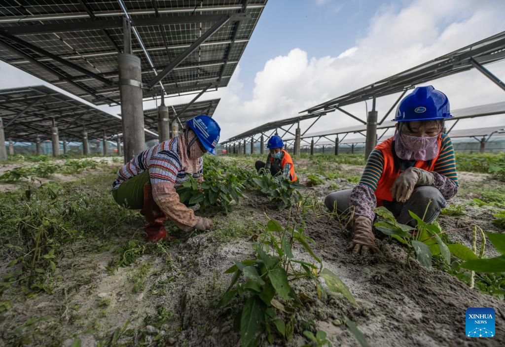 An aerial drone photo taken on March 15, 2024 shows a photovoltaic power station and vegetable greenhouses at Wangtangnan Village of Wengtian Town in Wenchang City, south China's Hainan Province. (Xinhua/Pu Xiaoxu)