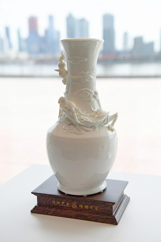 Dehua porcelain artwork Porcelain Vase with Auspicious Clouds and Dragon is presented at the "Blanc de Chine - Dehua Porcelain" international exhibition tour's promotional event at the UN headquarters in New York, March 15, 2024. (Xinhua/Li Rui)
