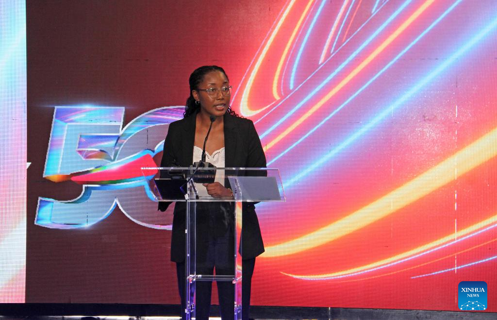 Namibia's Minister of Information, Communication and Technology Emma Theofelus speaks during a 5G technology demonstration in Windhoek, Namibia, on March 18, 2024. MTC, Namibia's largest mobile carrier, and Chinese company Huawei Technologies on Monday conducted the country's first 5G technology demonstration in Windhoek. (Photo by Musa C Kaseke/Xinhua)