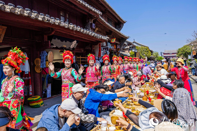 Tourists participate in a long-table banquet in Weishan county, Dali Bai Autonomous Prefecture, southwest China's Yunnan Province. (People's Daily Online/Xu Qian)