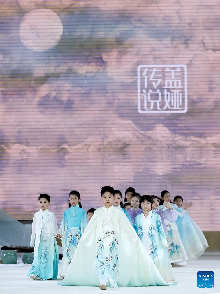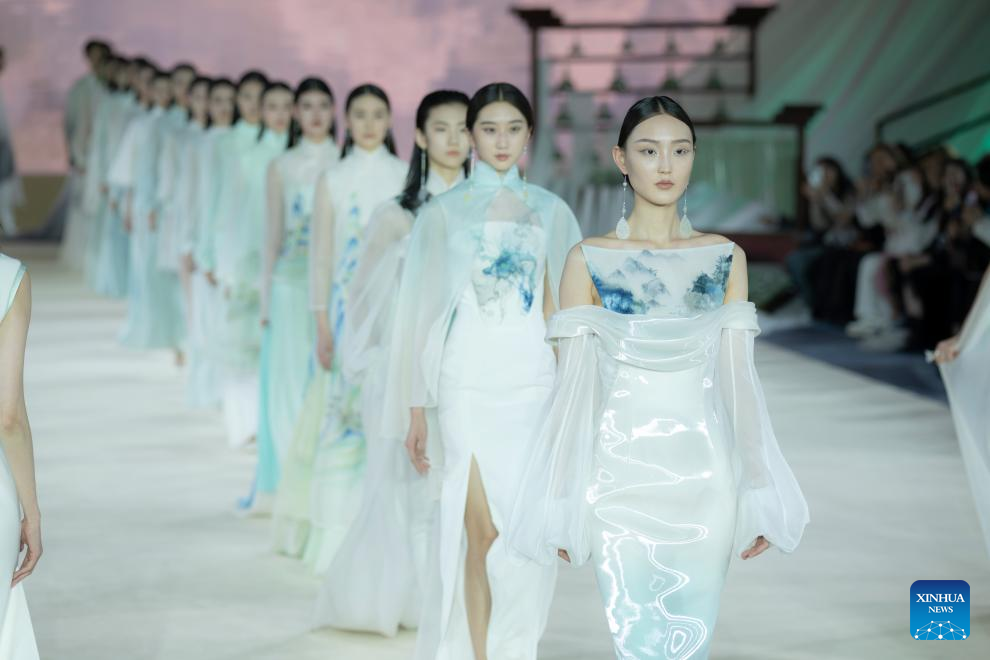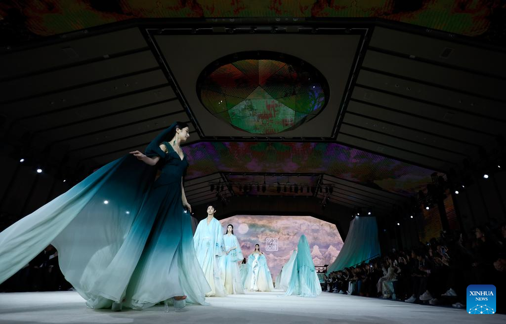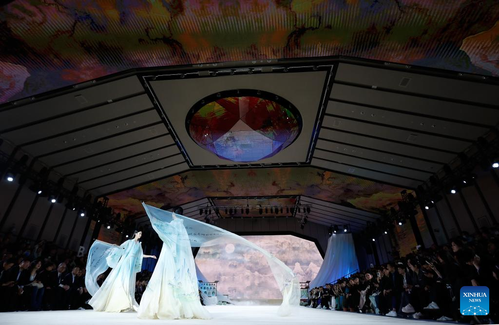 Models walk the catwalk for the Heaven Gaia Autumn/Winter 2024 collection show by Chinese fashion designer Xiong Ying during Beijing Fashion Week AW2024 in Beijing, capital of China, March 18, 2024. The Heaven Gaia show kicked off Beijing Fashion Week AW2024 on Monday. (Xinhua/Cai Yang)