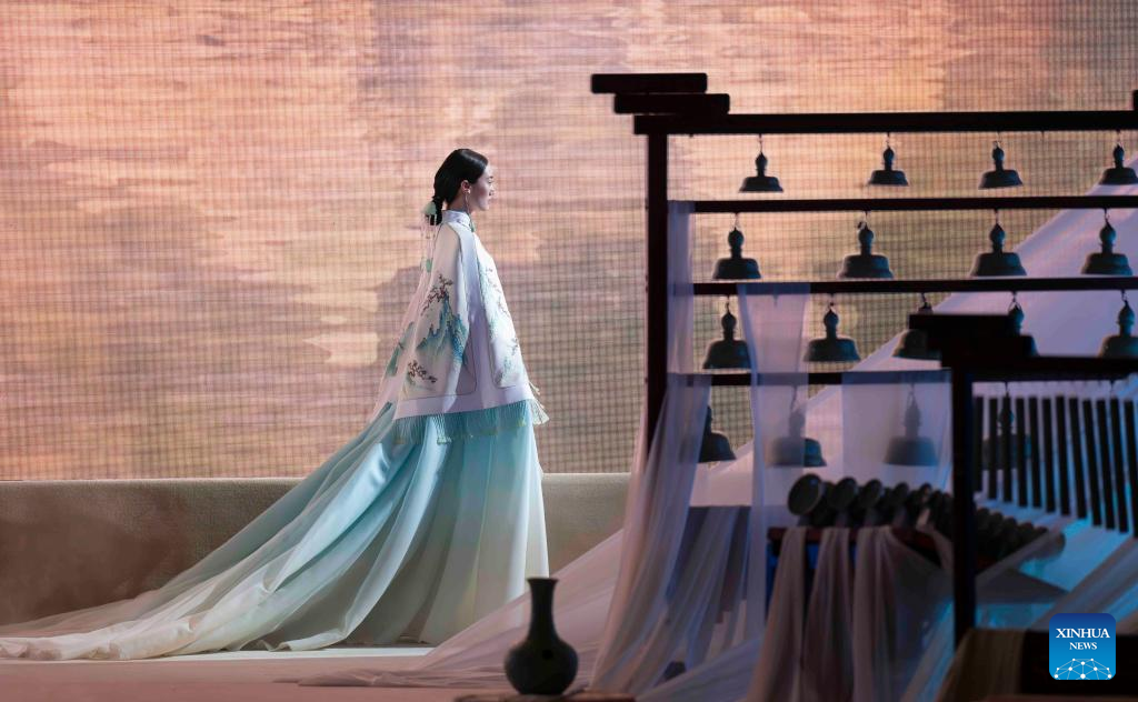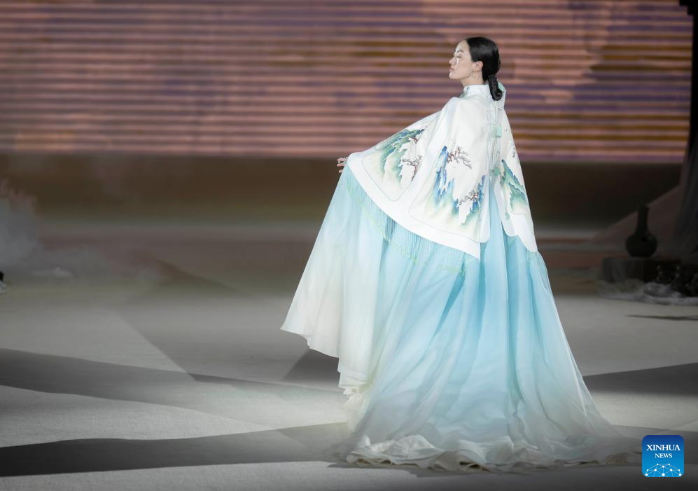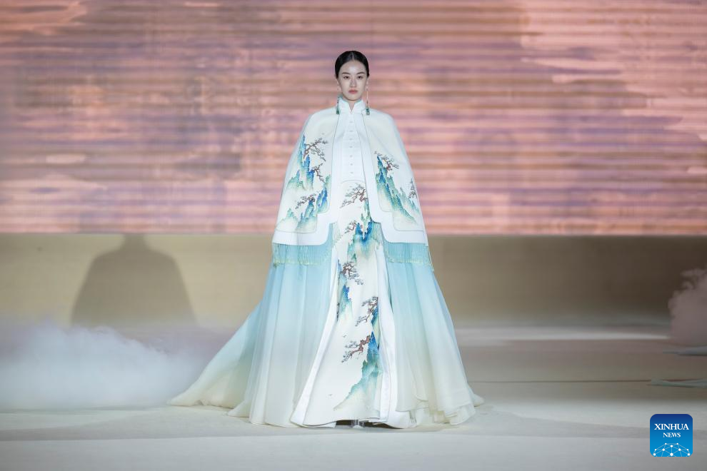 A model walks the catwalk for the Heaven Gaia Autumn/Winter 2024 collection show by Chinese fashion designer Xiong Ying during Beijing Fashion Week AW2024 in Beijing, capital of China, March 18, 2024. The Heaven Gaia show kicked off Beijing Fashion Week AW2024 on Monday. (Xinhua/Cai Yang)