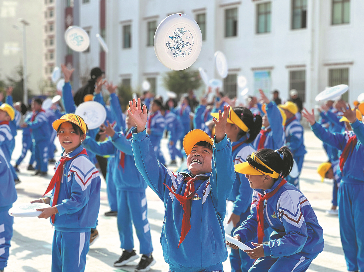 Students play frisbee at the Dongcheng Branch of Lhasa Experimental Primary School in April. PALDEN NYIMA/CHINA DAILY