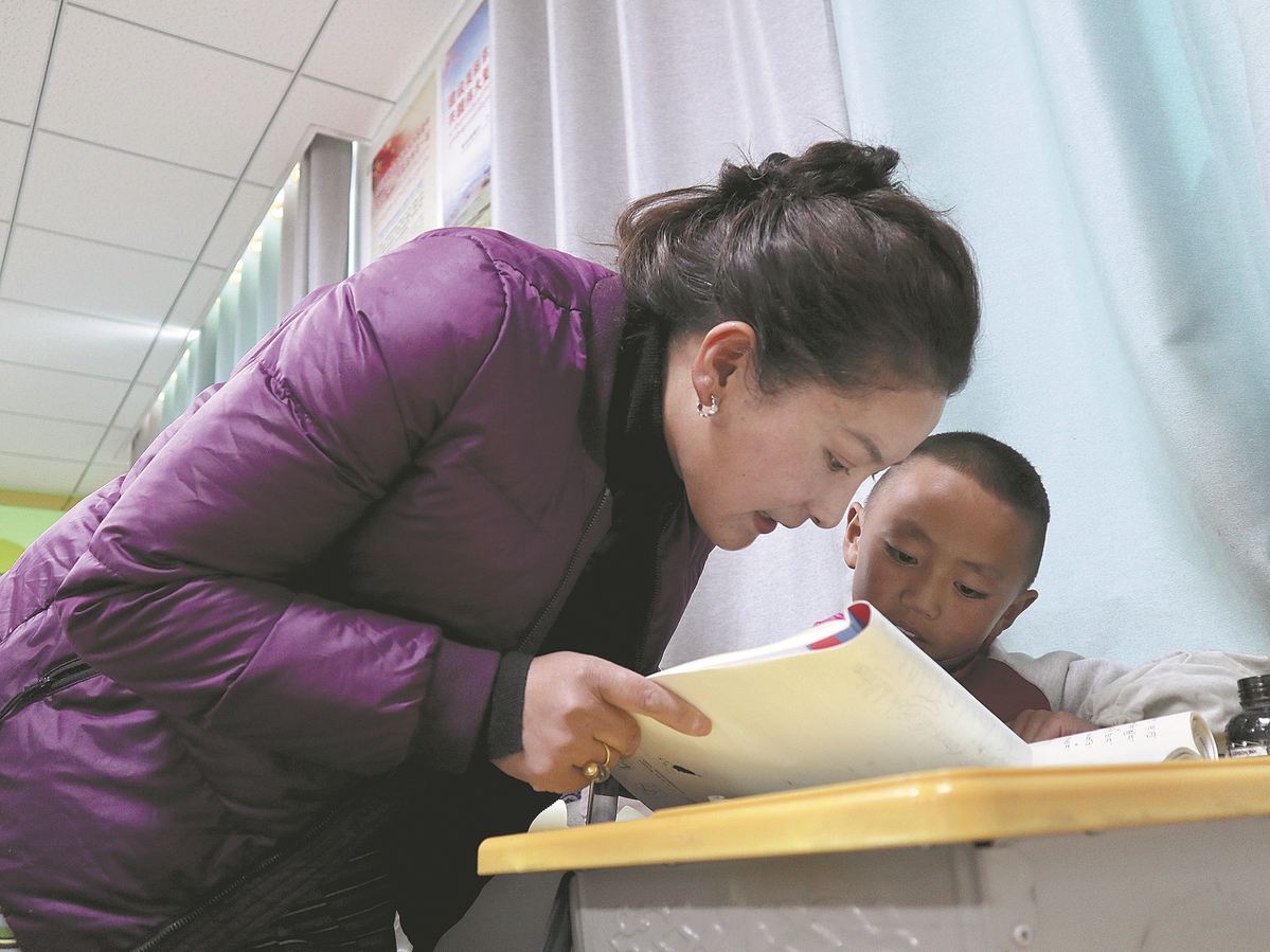 A Tibetan teacher instructs a student at a primary school in Sernyi district of Nagchu, Xizang autonomous region, in October. PALDEN NYIMA/CHINA DAILY